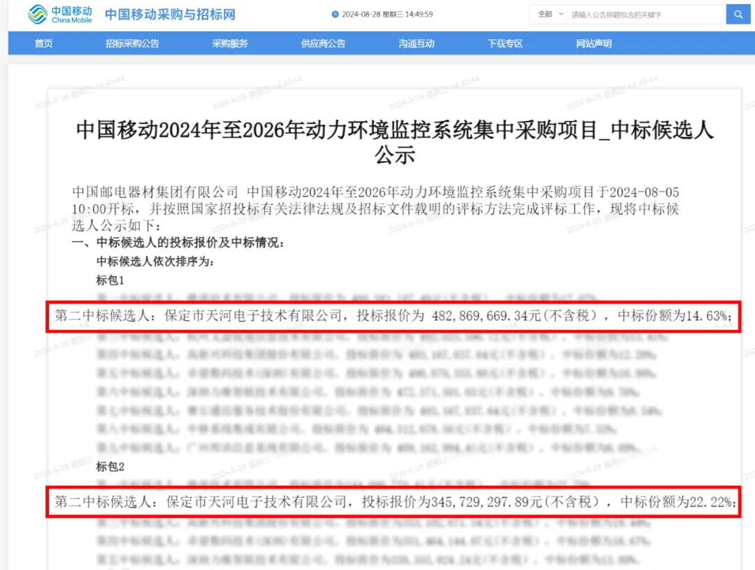 近日,保定市天河電子技術(shù)有限公司以兩個第二名的優(yōu)異成績,成功中標(biāo)中國移動2024-2026年動力環(huán)境監(jiān)控系統(tǒng)集采項目的匯聚機房與核心機樓雙標(biāo)段。