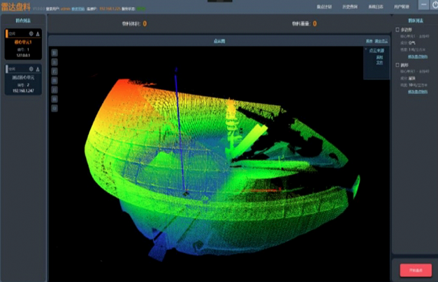斗輪機盤料儀部署在斗輪機臂架兩端,內(nèi)置盤料儀嵌入式程序。通過臂架動 作帶動斗輪機盤料儀對其下方的料堆進行掃描,同時從系統(tǒng)服務(wù)器實時獲取斗輪 機的走行位置、旋轉(zhuǎn)角度、俯仰角度及臂架的旋轉(zhuǎn)方向等維度定位數(shù)據(jù),將掃描 數(shù)據(jù)轉(zhuǎn)換為料堆的三維坐標點數(shù)據(jù),并將獲得的三維坐標點信息上傳至雷達應(yīng)用 單元進行處理.....